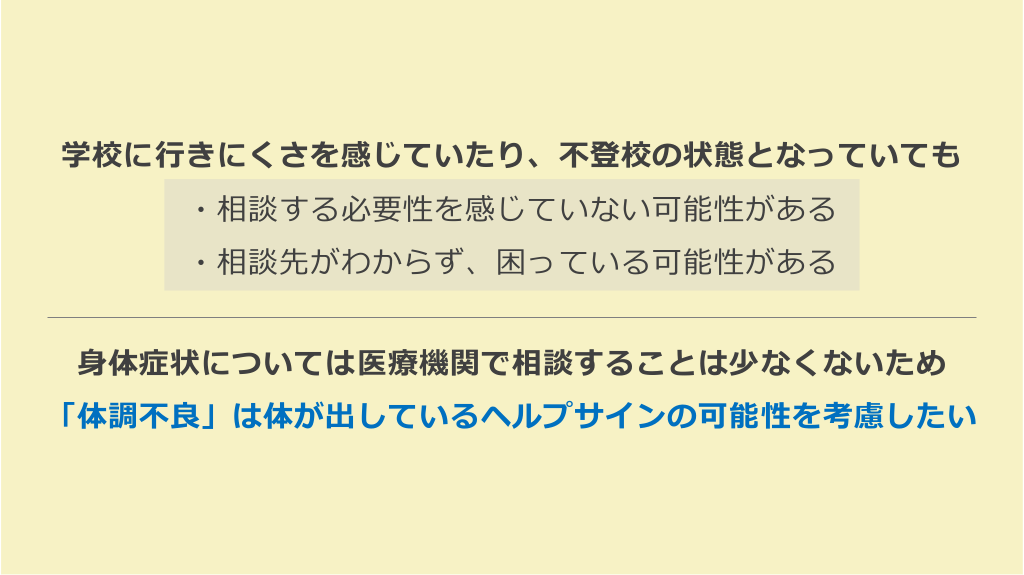#12. 学校に⾏きにくさを感じていたり、不登校の状態となっていても ・相談する必要性を感じていない可能性がある ・相談先がわからず、困っている可能性がある ⾝体症状については医療機関で相談することは少なくないため 「体調不良」は体が出しているヘルプサインの可能性を考慮したい