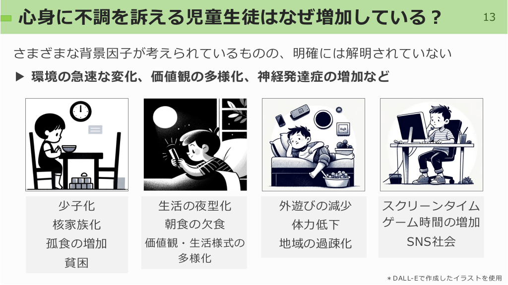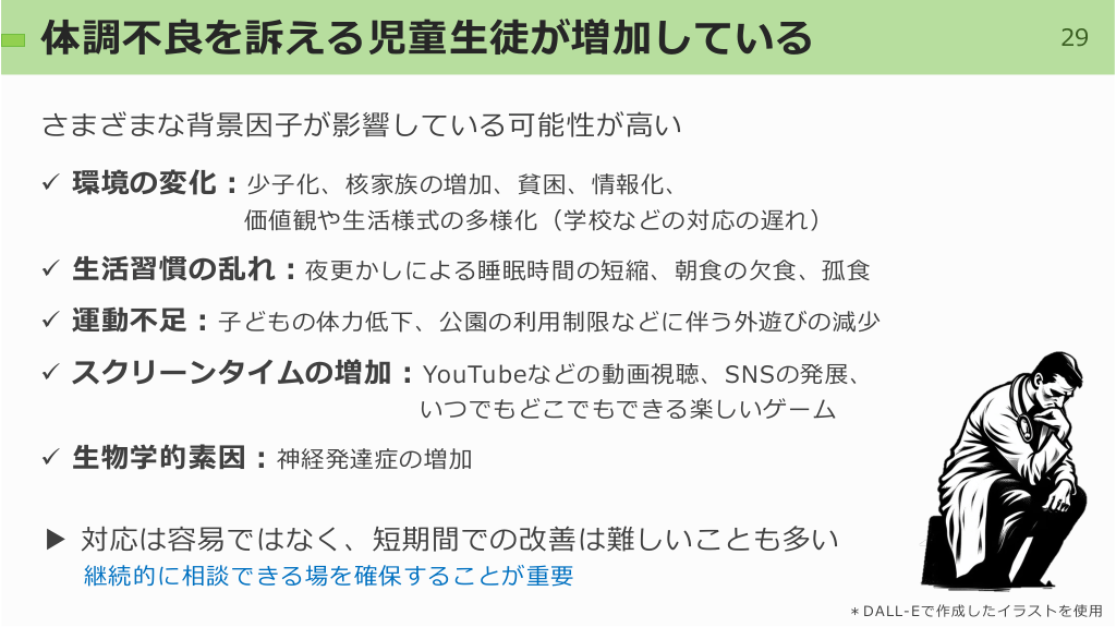#29. 体調不良を訴える児童⽣徒が増加している 29 さまざまな背景因⼦が影響している可能性が⾼い ü 環境の変化︓ 少⼦化、核家族の増加、貧困、情報化、 価値観や⽣活様式の多様化(学校などの対応の遅れ) ü ⽣活習慣の乱れ︓ 夜更かしによる睡眠時間の短縮、朝⾷の⽋⾷、孤⾷ ü 運動不⾜︓ ⼦どもの体⼒低下、公園の利⽤制限などに伴う外遊びの減少 ü スクリーンタイムの増加︓ YouTubeなどの動画視聴、SNSの発展、 いつでもどこでもできる楽しいゲーム ü ⽣物学的素因︓ 神経発達症の増加 ▶ 対応は容易ではなく、短期間での改善は難しいことも多い 継続的に相談できる場を確保することが重要 *DALL-Eで作成したイラストを使⽤