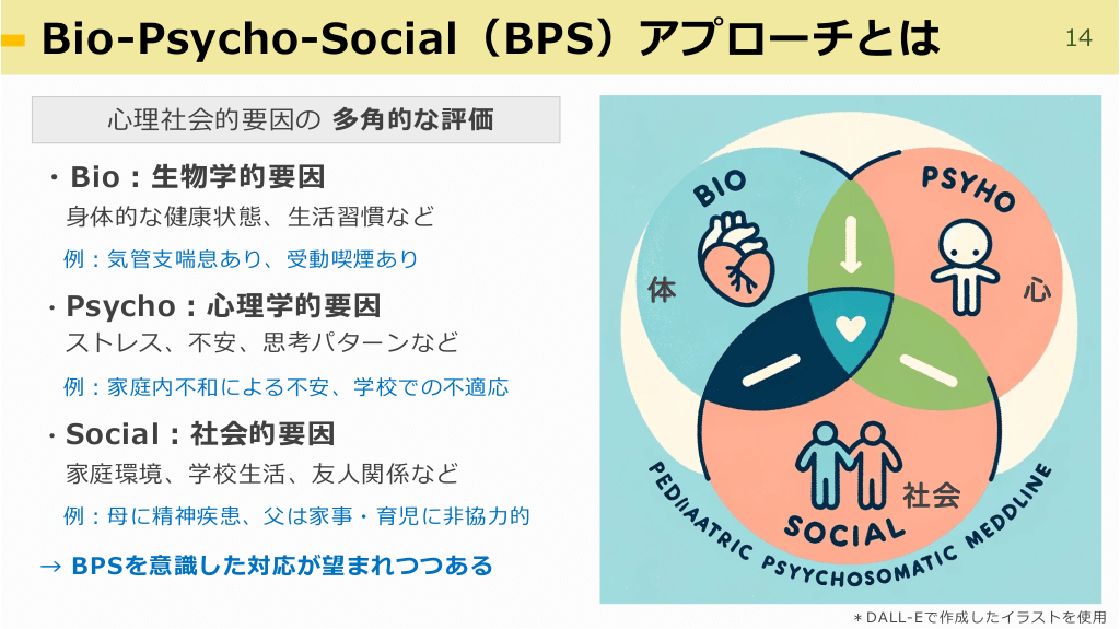 #14. Bio-Psycho-Social(BPS)アプローチとは 14 ⼼理社会的要因の 多⾓的な評価 ・Bio︓⽣物学的要因 ⾝体的な健康状態、⽣活習慣など 例︓気管⽀喘息あり、受動喫煙あり ・ Psycho︓⼼理学的要因 ストレス、不安、思考パターンなど 体 心 例︓家庭内不和による不安、学校での不適応 ・ Social︓社会的要因 家庭環境、学校⽣活、友⼈関係など 例︓⺟に精神疾患、⽗は家事・育児に⾮協⼒的 社会 → BPSを意識した対応が望まれつつある *DALL-Eで作成したイラストを使⽤