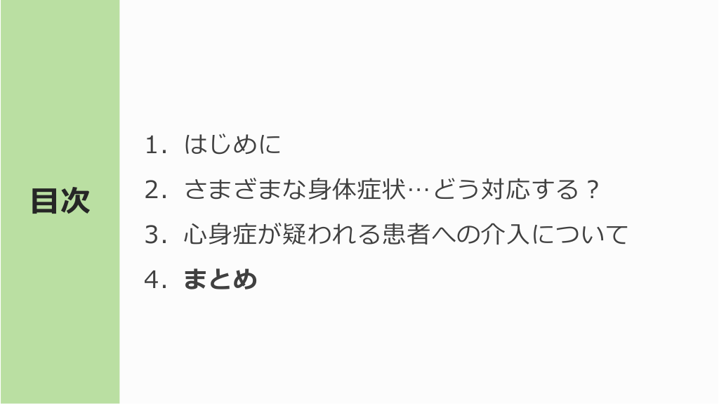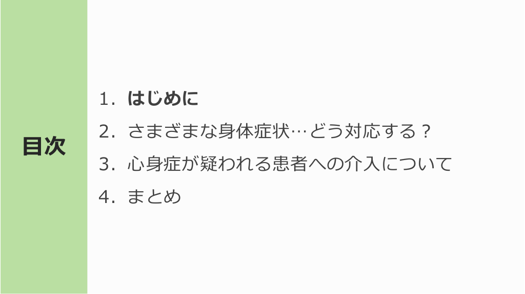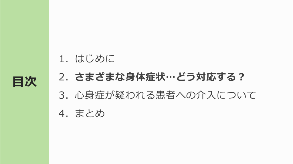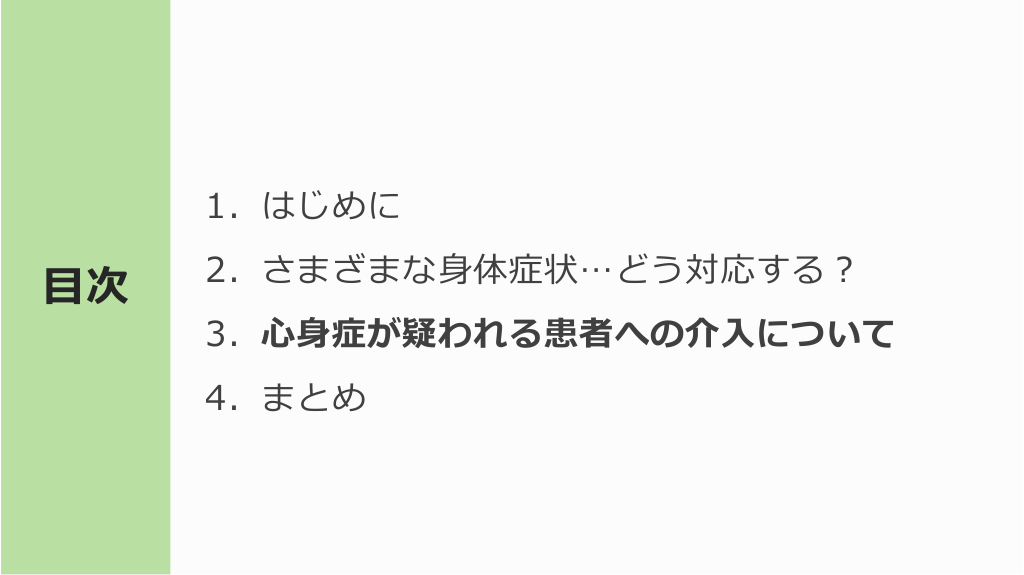 #3. 1. はじめに ⽬次 2. さまざまな⾝体症状…どう対応する︖ 3. ⼼⾝症が疑われる患者への介⼊について 4. まとめ