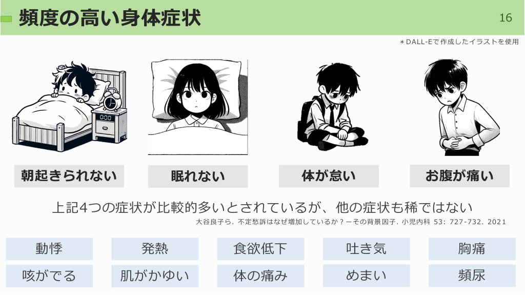 #16. 頻度の⾼い⾝体症状 16 *DALL-Eで作成したイラストを使⽤ 朝起きられない 体が怠い 眠れない お腹が痛い 上記4つの症状が⽐較的多いとされているが、他の症状も稀ではない ⼤⾕良⼦ら. 不定愁訴はなぜ増加しているか︖ーその背景因⼦. ⼩児内科 5 3 : 7 2 7 -7 3 2 . 2 0 2 1 動悸 発熱 ⾷欲低下 吐き気 胸痛 咳がでる 肌がかゆい 体の痛み めまい 頻尿