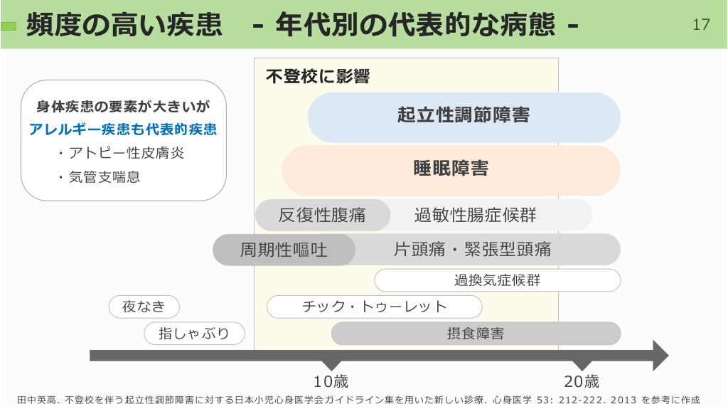 #17. 頻度の⾼い疾患 - 年代別の代表的な病態 - 17 不登校に影響 ⾝体疾患の要素が⼤きいが 起⽴性調節障害 アレルギー疾患も代表的疾患 ・アトピー性⽪膚炎 睡眠障害 ・気管⽀喘息 反復性腹痛 周期性嘔吐 過敏性腸症候群 ⽚頭痛・緊張型頭痛 過換気症候群 夜なき チック・トゥーレット 指しゃぶり 摂⾷障害 10歳 20歳 ⽥中英⾼. 不登校を伴う起⽴性調節障害に対する⽇本⼩児⼼⾝医学会ガイドライン集を⽤いた新しい診療. ⼼⾝医学 5 3 : 2 1 2 -2 2 2 . 2 0 1 3 を参考に作成