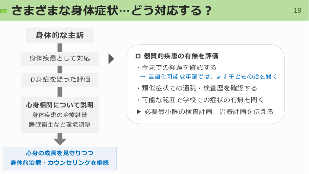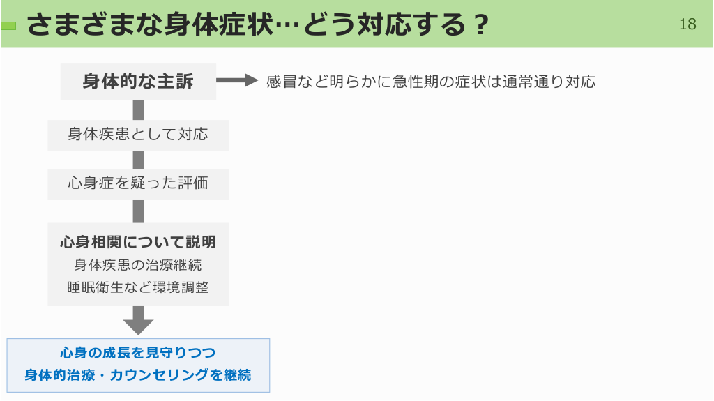 #18. さまざまな⾝体症状…どう対応する︖ ⾝体的な主訴 ⾝体疾患として対応 ⼼⾝症を疑った評価 ⼼⾝相関について説明 ⾝体疾患の治療継続 睡眠衛⽣など環境調整 ⼼⾝の成⻑を⾒守りつつ ⾝体的治療・カウンセリングを継続 感冒など明らかに急性期の症状は通常通り対応 18