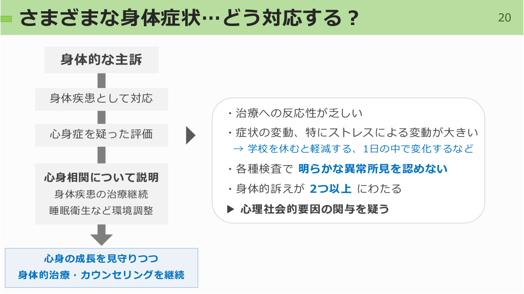 #19. さまざまな⾝体症状…どう対応する︖ ⾝体的な主訴 ⾝体疾患として対応 ⼼⾝症を疑った評価 ⼼⾝相関について説明 ⾝体疾患の治療継続 睡眠衛⽣など環境調整 ⼼⾝の成⻑を⾒守りつつ ⾝体的治療・カウンセリングを継続 p 器質的疾患の有無を評価 ・今までの経過を確認する → ⾔語化可能な年齢では、まず⼦どもの話を聞く ・類似症状での通院・検査歴を確認する ・可能な範囲で学校での症状の有無を聞く ▶ 必要最⼩限の検査計画、治療計画を伝える 19