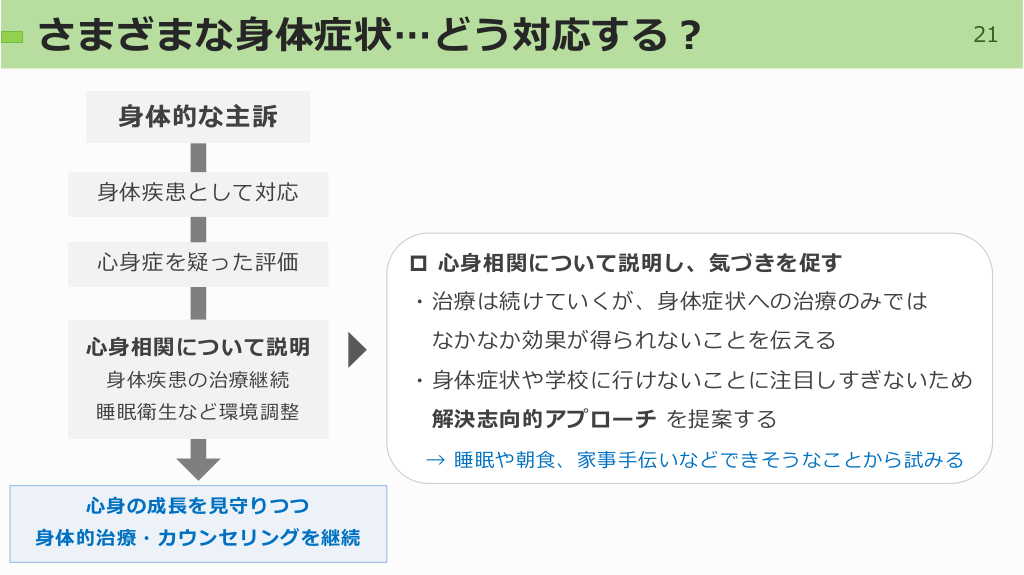 #20. さまざまな⾝体症状…どう対応する︖ ⾝体的な主訴 ⾝体疾患として対応 ⼼⾝症を疑った評価 ⼼⾝相関について説明 ⾝体疾患の治療継続 睡眠衛⽣など環境調整 ⼼⾝の成⻑を⾒守りつつ ⾝体的治療・カウンセリングを継続 ・治療への反応性が乏しい ・症状の変動、特にストレスによる変動が⼤きい → 学校を休むと軽減する、1⽇の中で変化するなど ・各種検査で 明らかな異常所⾒を認めない ・⾝体的訴えが 2つ以上 にわたる ▶ ⼼理社会的要因の関与を疑う 20