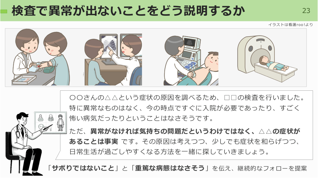 #23. 検査で異常が出ないことをどう説明するか 23 イラストは看護roo!より 〇〇さんの△△という症状の原因を調べるため、□□の検査を⾏いました。 特に異常なものはなく、今の時点ですぐに⼊院が必要であったり、すごく 怖い病気だったりということはなさそうです。 ただ、異常がなければ気持ちの問題だというわけではなく、△△の症状が あることは事実 です。その原因は考えつつ、少しでも症状を和らげつつ、 ⽇常⽣活が過ごしやすくなる⽅法を⼀緒に探していきましょう。 「サボりではないこと」 と 「重篤な病態はなさそう」 を伝え、継続的なフォローを提案