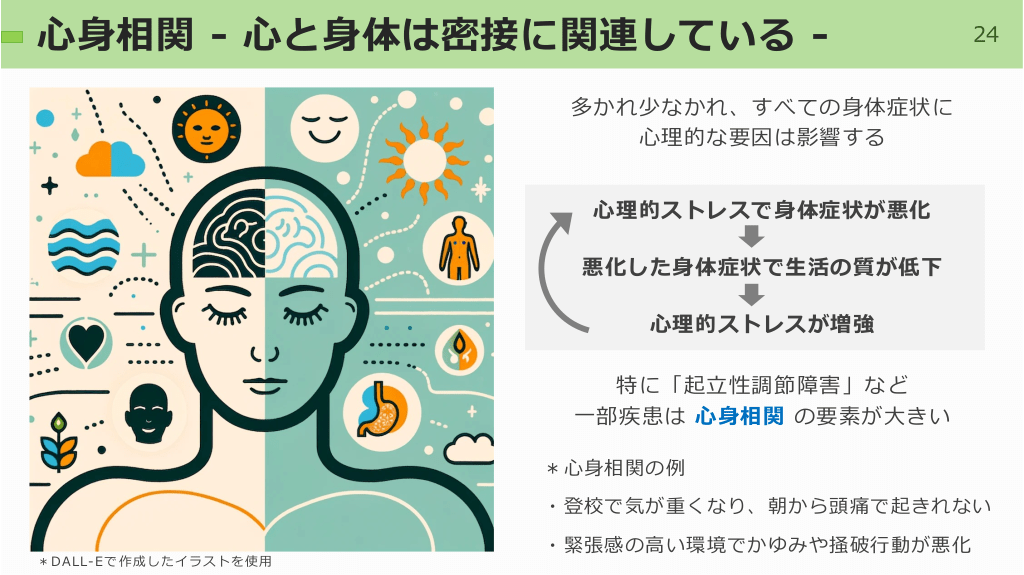 #24. ⼼⾝相関 - ⼼と⾝体は密接に関連している - 24 多かれ少なかれ、すべての⾝体症状に ⼼理的な要因は影響する ⼼理的ストレスで⾝体症状が悪化 悪化した⾝体症状で⽣活の質が低下 ⼼理的ストレスが増強 特に「起⽴性調節障害」など ⼀部疾患は ⼼⾝相関 の要素が⼤きい *⼼⾝相関の例 ・登校で気が重くなり、朝から頭痛で起きれない *DALL-Eで作成したイラストを使⽤ ・緊張感の⾼い環境でかゆみや掻破⾏動が悪化