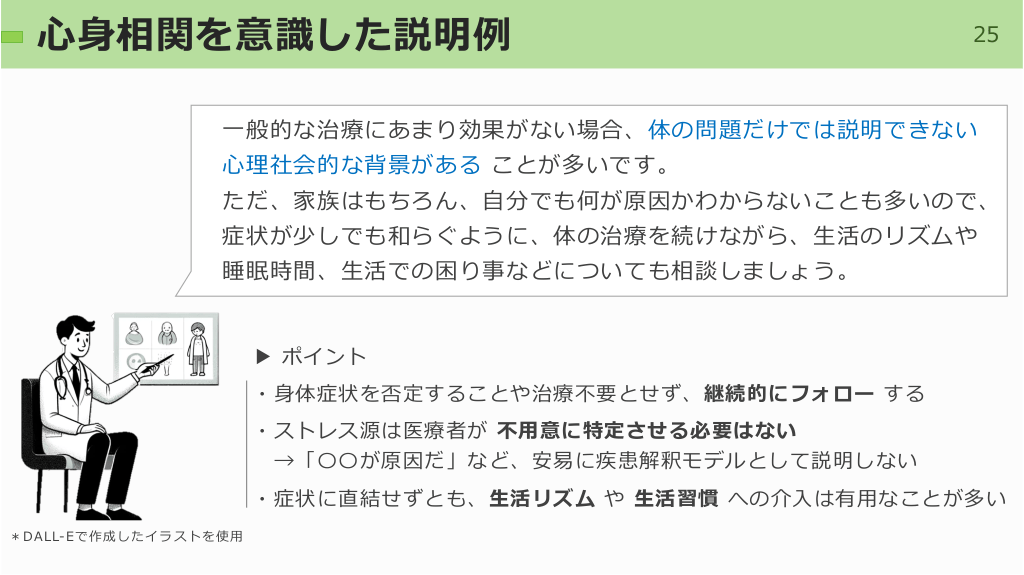 #25. ⼼⾝相関を意識した説明例 25 ⼀般的な治療にあまり効果がない場合、体の問題だけでは説明できない ⼼理社会的な背景がある ことが多いです。 ただ、家族はもちろん、⾃分でも何が原因かわからないことも多いので、 症状が少しでも和らぐように、体の治療を続けながら、⽣活のリズムや 睡眠時間、⽣活での困り事などについても相談しましょう。 ▶ ポイント ・⾝体症状を否定することや治療不要とせず、継続的にフォロー する ・ストレス源は医療者が 不⽤意に特定させる必要はない →「〇〇が原因だ」など、安易に疾患解釈モデルとして説明しない ・症状に直結せずとも、⽣活リズム や ⽣活習慣 への介⼊は有⽤なことが多い *DALL-Eで作成したイラストを使⽤
