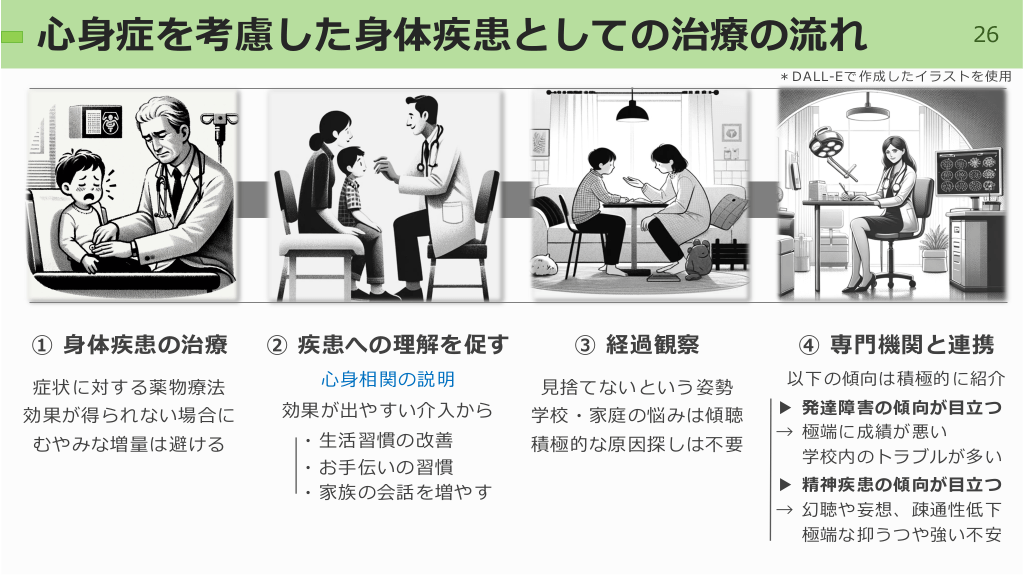 #26. ⼼⾝症を考慮した⾝体疾患としての治療の流れ 26 *DALL-Eで作成したイラストを使⽤ ① ⾝体疾患の治療 ② 疾患への理解を促す ③ 経過観察 症状に対する薬物療法 ⼼⾝相関の説明 ⾒捨てないという姿勢 効果が得られない場合に むやみな増量は避ける 効果が出やすい介⼊から ・⽣活習慣の改善 ・お⼿伝いの習慣 ・家族の会話を増やす 学校・家庭の悩みは傾聴 積極的な原因探しは不要 ④ 専⾨機関と連携 以下の傾向は積極的に紹介 ▶ 発達障害の傾向が⽬⽴つ → 極端に成績が悪い 学校内のトラブルが多い ▶ 精神疾患の傾向が⽬⽴つ → 幻聴や妄想、疎通性低下 極端な抑うつや強い不安