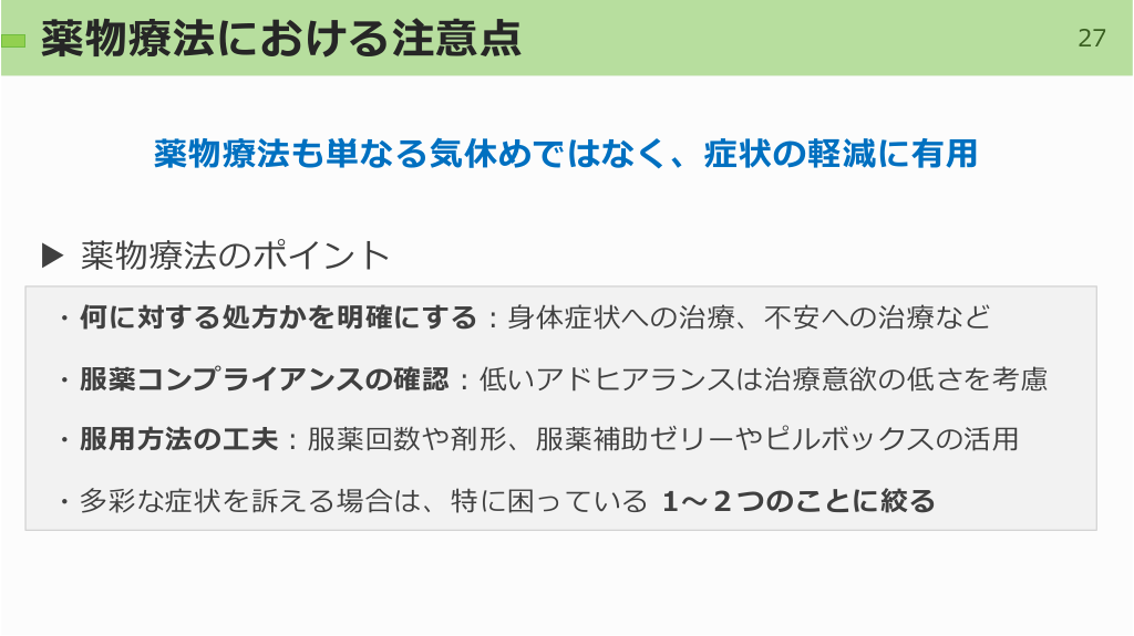 #27. 薬物療法における注意点 薬物療法も単なる気休めではなく、症状の軽減に有⽤ ▶ 薬物療法のポイント ・何に対する処⽅かを明確にする︓⾝体症状への治療、不安への治療など ・服薬コンプライアンスの確認︓低いアドヒアランスは治療意欲の低さを考慮 ・服⽤⽅法の⼯夫︓服薬回数や剤形、服薬補助ゼリーやピルボックスの活⽤ ・多彩な症状を訴える場合は、特に困っている 1〜2つのことに絞る 27