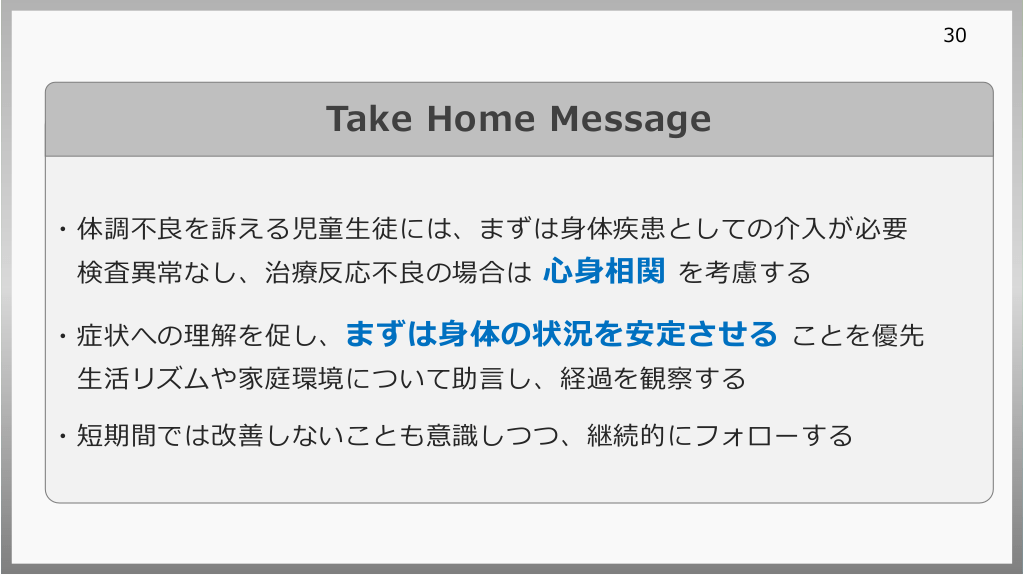 #30. 30 Take Home Message ・体調不良を訴える児童⽣徒には、まずは⾝体疾患としての介⼊が必要 検査異常なし、治療反応不良の場合は ⼼⾝相関 を考慮する ・症状への理解を促し、 まずは⾝体の状況を安定させる ことを優先 ⽣活リズムや家庭環境について助⾔し、経過を観察する ・短期間では改善しないことも意識しつつ、継続的にフォローする