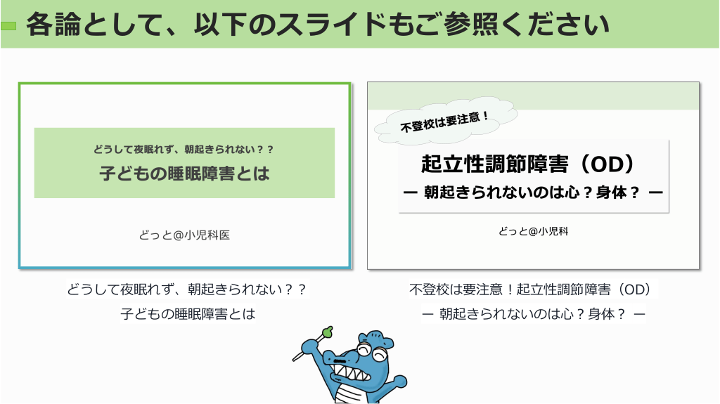 #31. 各論として、以下のスライドもご参照ください どうして夜眠れず、朝起きられない︖︖ 不登校は要注意︕起⽴性調節障害(OD) ⼦どもの睡眠障害とは ー 朝起きられないのは⼼︖⾝体︖ ー