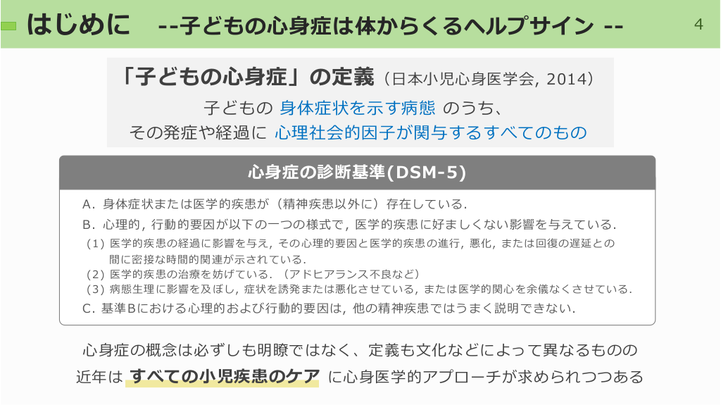 #4. はじめに --⼦どもの⼼⾝症は体からくるヘルプサイン -- 「⼦どもの⼼⾝症」の定義 (⽇本⼩児⼼⾝医学会, 2014) ⼦どもの ⾝体症状を⽰す病態 のうち、 その発症や経過に ⼼理社会的因⼦が関与するすべてのもの ⼼⾝症の診断基準(DSM-5) A. ⾝体症状または医学的疾患が(精神疾患以外に)存在している. B. ⼼理的, ⾏動的要因が以下の⼀つの様式で, 医学的疾患に好ましくない影響を与えている. (1) 医学的疾患の経過に影響を与え, その⼼理的要因と医学的疾患の進⾏, 悪化, または回復の遅延との 間に密接な時間的関連が⽰されている. (2) 医学的疾患の治療を妨げている. (アドヒアランス不良など) (3) 病態⽣理に影響を及ぼし, 症状を誘発または悪化させている, または医学的関⼼を余儀なくさせている. C. 基準Bにおける⼼理的および⾏動的要因は, 他の精神疾患ではうまく説明できない. ⼼⾝症の概念は必ずしも明瞭ではなく、定義も⽂化などによって異なるものの 近年は すべての⼩児疾患のケア に⼼⾝医学的アプローチが求められつつある 4