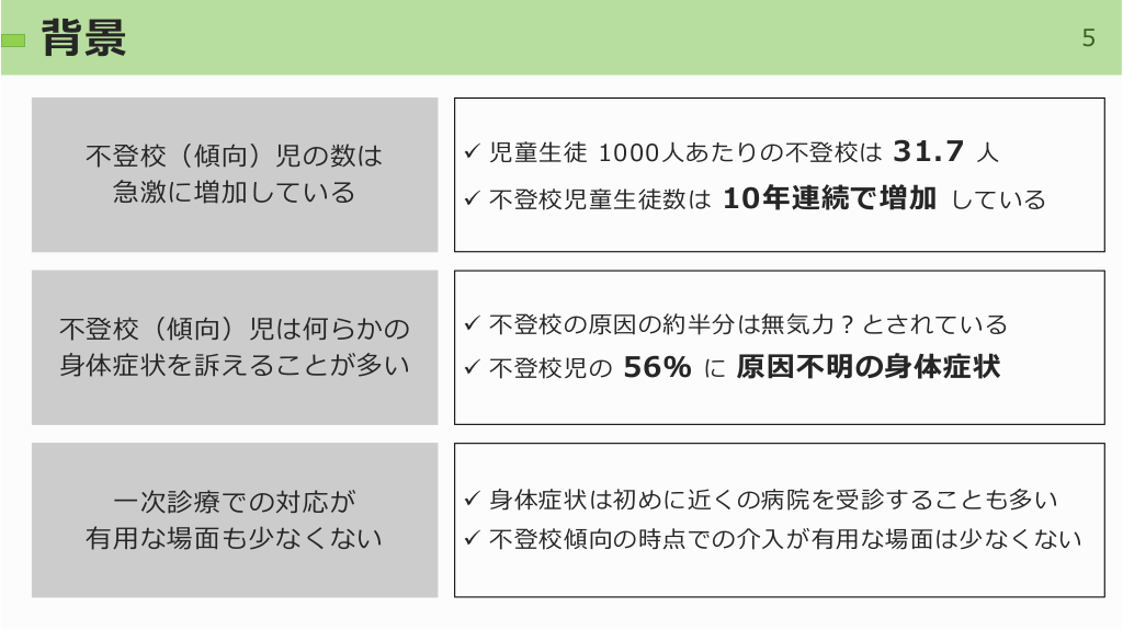 #5. 背景 不登校(傾向)児の数は 急激に増加している 不登校(傾向)児は何らかの ⾝体症状を訴えることが多い ⼀次診療での対応が 有⽤な場⾯も少なくない 5 ü 児童⽣徒 1000⼈あたりの不登校は ü 不登校児童⽣徒数は 31.7 ⼈ 10年連続で増加 している ü 不登校の原因の約半分は無気⼒︖とされている ü 不登校児の 56% に 原因不明の⾝体症状 ü ⾝体症状は初めに近くの病院を受診することも多い ü 不登校傾向の時点での介⼊が有⽤な場⾯は少なくない