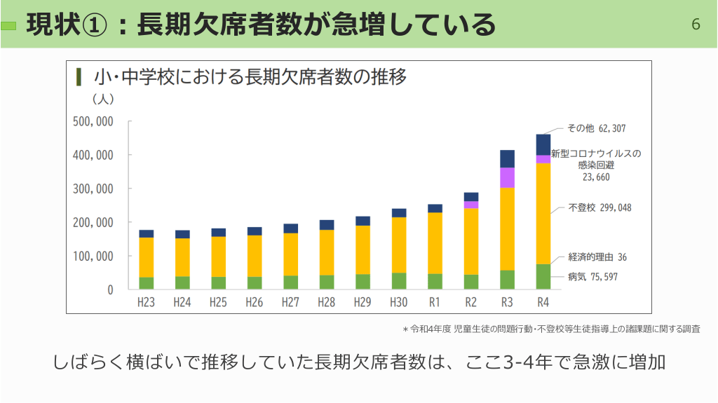 #6. 現状①︓⻑期⽋席者数が急増している 6 *令和4年度 児童⽣徒の問題⾏動・不登校等⽣徒指導上の諸課題に関する調査 しばらく横ばいで推移していた⻑期⽋席者数は、ここ3-4年で急激に増加