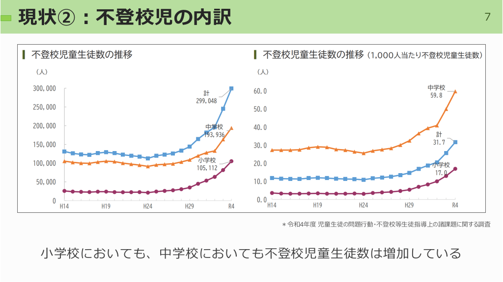 #7. 現状②︓不登校児の内訳 7 *令和4年度 児童⽣徒の問題⾏動・不登校等⽣徒指導上の諸課題に関する調査 ⼩学校においても、中学校においても不登校児童⽣徒数は増加している