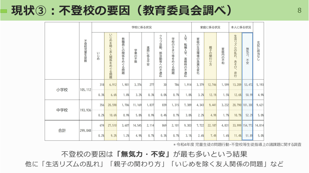 #8. 現状③︓不登校の要因(教育委員会調べ) 8 *令和4年度 児童⽣徒の問題⾏動・不登校等⽣徒指導上の諸課題に関する調査 不登校の要因は「無気⼒・不安」が最も多いという結果 他に「⽣活リズムの乱れ」「親⼦の関わり⽅」「いじめを除く友⼈関係の問題」など