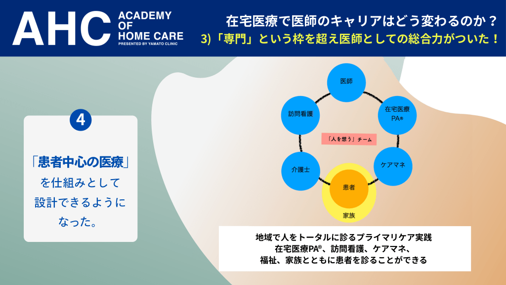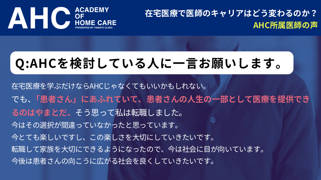 #28. 在宅医療で医師のキャリアはどう変わるのか? AHC所属医師の声 Q:AHCを検討している人に一言お願いします。 在宅医療を学ぶだけならAHCじゃなくてもいいかもしれない。 でも、 「患者さん」にあふれていて、患者さんの人生の一部として医療を提供でき るのはやまとだ、そう思って私は転職しました。 今はその選択が間違っていなかったと思っています。 今とても楽しいですし、この楽しさを大切にしていきたいです。 転職して家族を大切にできるようになったので、今は社会に目が向いています。 今後は患者さんの向こうに広がる社会を良くしていきたいです。