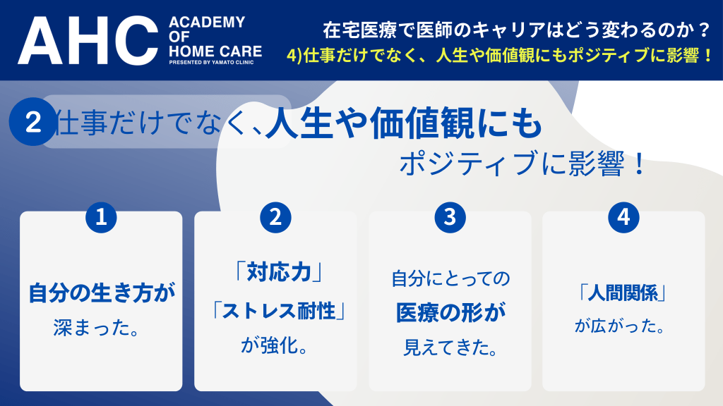 #11. 在宅医療で医師のキャリアはどう変わるのか? 4)仕事だけでなく、人生や価値観にもポジティブに影響! 仕事だけでなく、 人生や価値観にも ポジティブに影響! 1 自分の生き方が 深まった。 2 3 「対応力」 自分にとっての 「ストレス耐性」 医療の形が が強化。 見えてきた。 4 「人間関係」 が広がった。