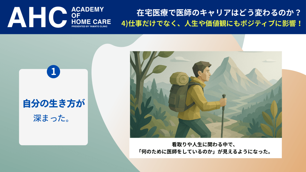 #12. 在宅医療で医師のキャリアはどう変わるのか? 4)仕事だけでなく、人生や価値観にもポジティブに影響! 1 自分の生き方が 深まった。 看取りや人生に関わる中で、 「何のために医師をしているのか」が見えるようになった。