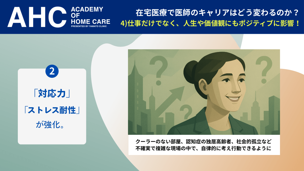 #13. 在宅医療で医師のキャリアはどう変わるのか? 4)仕事だけでなく、人生や価値観にもポジティブに影響! 2 「対応力」 「ストレス耐性」 が強化。 クーラーのない部屋、認知症の独居高齢者、社会的孤立など 不確実で複雑な現場の中で、自律的に考え行動できるように