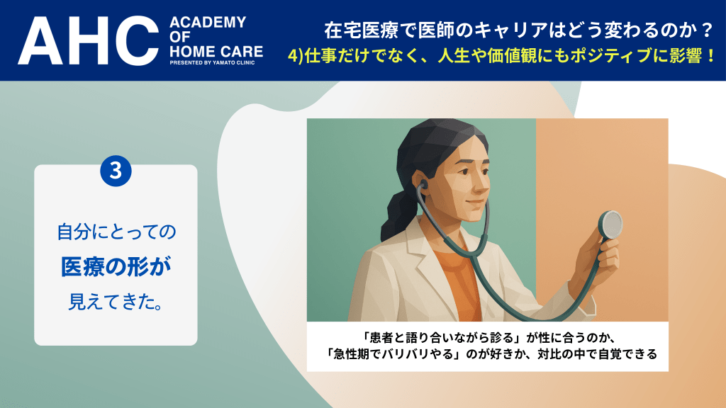 #14. 在宅医療で医師のキャリアはどう変わるのか? 4)仕事だけでなく、人生や価値観にもポジティブに影響! 3 自分にとっての 医療の形が 見えてきた。 「患者と語り合いながら診る」が性に合うのか、 「急性期でバリバリやる」のが好きか、対比の中で自覚できる