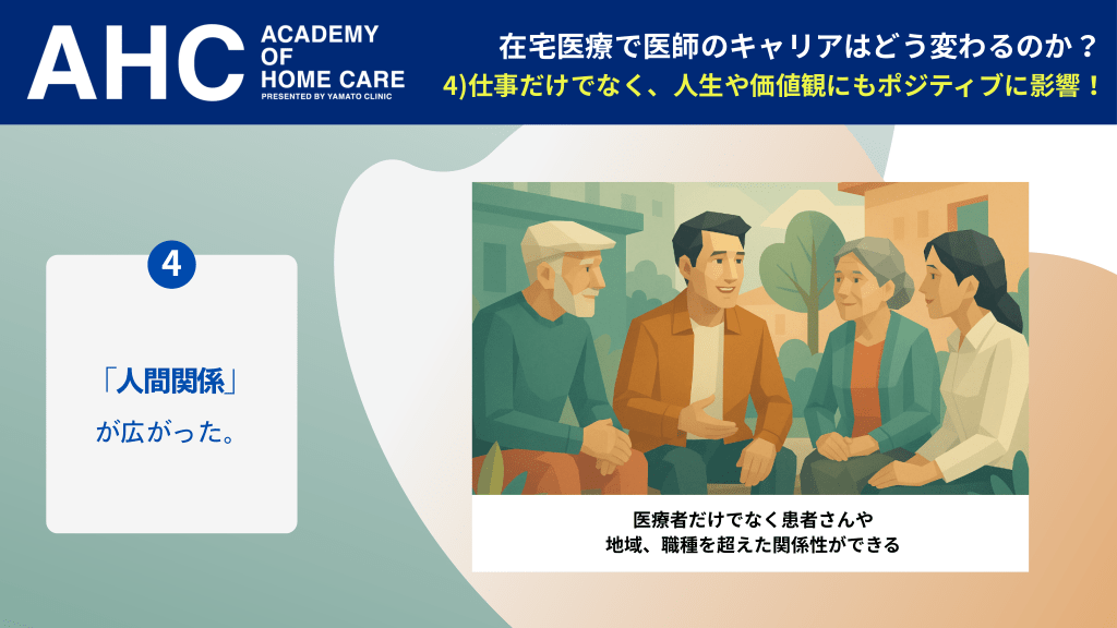 #15. 在宅医療で医師のキャリアはどう変わるのか? 4)仕事だけでなく、人生や価値観にもポジティブに影響! 4 「人間関係」 が広がった。 医療者だけでなく患者さんや 地域、職種を超えた関係性ができる