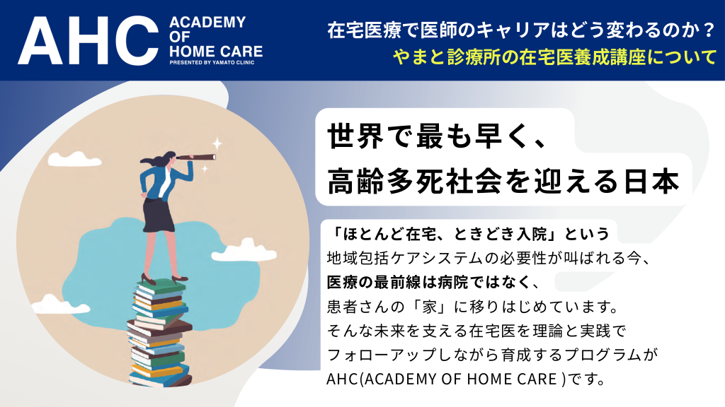 #17. 在宅医療で医師のキャリアはどう変わるのか? やまと診療所の在宅医養成講座について 世界で最も早く、 高齢多死社会を迎える日本 「ほとんど在宅、ときどき入院」という 地域包括ケアシステムの必要性が叫ばれる今、 医療の最前線は病院ではなく、 患者さんの「家」に移りはじめています。 そんな未来を支える在宅医を理論と実践で フォローアップしながら育成するプログラムが AHC(ACADEMY OF HOME CARE )です。