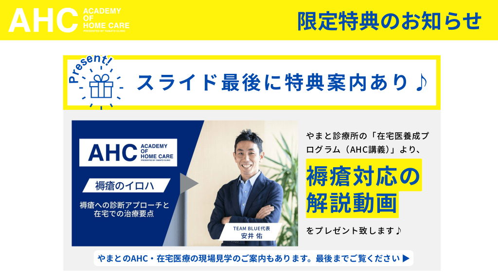 #2. Pre 限定特典のお知らせ n t e s ! スライド最後に特典案内あり♪ やまと診療所の「在宅医養成プ ログラム(AHC講義)」より、 褥瘡対応の 解説動画 をプレゼント致します♪ やまとのAHC・在宅医療の現場見学のご案内もあります。最後までご覧ください ▶