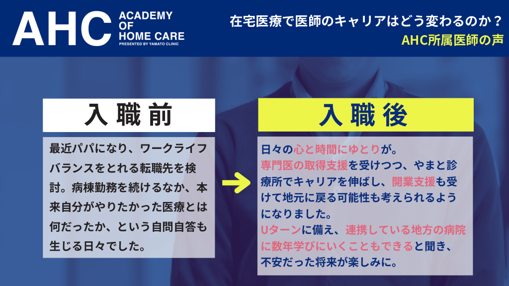 #24. 在宅医療で医師のキャリアはどう変わるのか? AHC所属医師の声 入職前 入職後 最近パパになり、ワークライフ 日々の心と時間にゆとりが。 専門医の取得支援を受けつつ、やまと診 療所でキャリアを伸ばし、開業支援も受 けて地元に戻る可能性も考えられるよう になりました。 Uターンに備え、連携している地方の病院 に数年学びにいくこともできると聞き、 不安だった将来が楽しみに。 バランスをとれる転職先を検 討。病棟勤務を続けるなか、本 来自分がやりたかった医療とは 何だったか、という自問自答も 生じる日々でした。