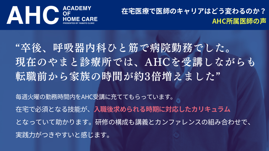 #25. 在宅医療で医師のキャリアはどう変わるのか? AHC所属医師の声 “卒後、呼吸器内科ひと筋で病院勤務でした。 現在のやまと診療所では、AHCを受講しながらも 転職前から家族の時間が約3倍増えました” 毎週火曜の勤務時間内をAHC受講に充ててもらっています。 在宅で必須となる技能が、入職後求められる時期に対応したカリキュラム となっていて助かります。研修の構成も講義とカンファレンスの組み合わせで、 実践力がつきやすいと感じます。