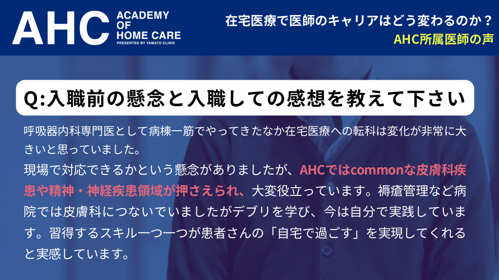 #26. 在宅医療で医師のキャリアはどう変わるのか? AHC所属医師の声 Q:入職前の懸念と入職しての感想を教えて下さい 呼吸器内科専門医として病棟一筋でやってきたなか在宅医療への転科は変化が非常に大 きいと思っていました。 現場で対応できるかという懸念がありましたが、AHCではcommonな皮膚科疾 患や精神・神経疾患領域が押さえられ、大変役立っています。褥瘡管理など病 院では皮膚科につないでいましたがデブリを学び、今は自分で実践していま す。習得するスキル一つ一つが患者さんの「自宅で過ごす」を実現してくれる と実感しています。