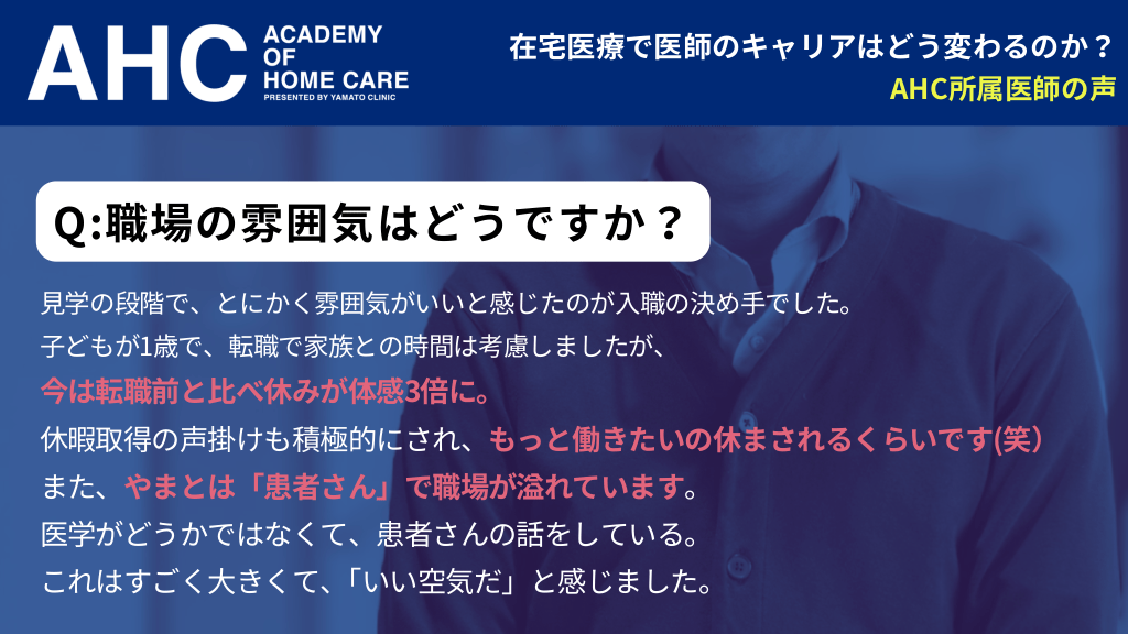 #27. 在宅医療で医師のキャリアはどう変わるのか? AHC所属医師の声 Q:職場の雰囲気はどうですか? 見学の段階で、とにかく雰囲気がいいと感じたのが入職の決め手でした。 子どもが1歳で、転職で家族との時間は考慮しましたが、 今は転職前と比べ休みが体感3倍に。 休暇取得の声掛けも積極的にされ、もっと働きたいの休まされるくらいです(笑) また、やまとは「患者さん」で職場が溢れています。 医学がどうかではなくて、患者さんの話をしている。 これはすごく大きくて、 「いい空気だ」と感じました。