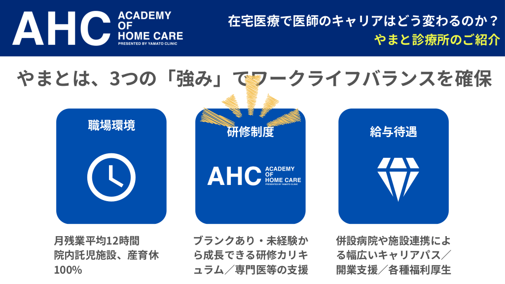 #30. 在宅医療で医師のキャリアはどう変わるのか? やまと診療所のご紹介 やまとは、3つの「強み」でワークライフバランスを確保 職場環境 月残業平均12時間 院内託児施設、産育休 100% 研修制度 給与待遇 ブランクあり・未経験か ら成長できる研修カリキ ュラム/専門医等の支援 併設病院や施設連携によ る幅広いキャリアパス/ 開業支援/各種福利厚生