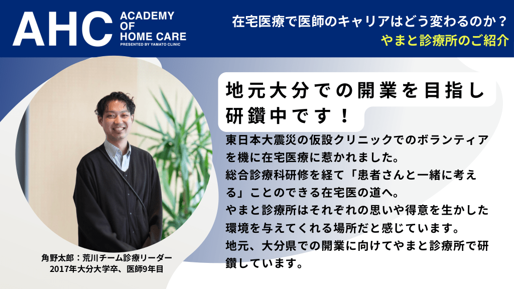 #32. 在宅医療で医師のキャリアはどう変わるのか? やまとのチーム医療|物語をつむぐ「在宅医療PA®」 やまと診療所のご紹介 地元大分での開業を目指し 研鑽中です! 東日本大震災の仮設クリニックでのボランティア を機に在宅医療に惹かれました。 総合診療科研修を経て「患者さんと一緒に考え る」ことのできる在宅医の道へ。 やまと診療所はそれぞれの思いや得意を生かした 環境を与えてくれる場所だと感じています。 角野太郎:荒川チーム診療リーダー 2017年大分大学卒、医師9年目 地元、大分県での開業に向けてやまと診療所で研 鑽しています。