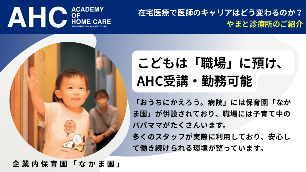 #33. 在宅医療で医師のキャリアはどう変わるのか? やまと診療所のご紹介 こどもは「職場」に預け、 AHC受講・勤務可能 「おうちにかえろう。病院」には保育園「なか ま園」が併設されており、職場には子育て中の パパママがたくさんいます。 多くのスタッフが実際に利用しており、安心し て働き続けられる環境が整っています。 企業内保育園「なかま園」