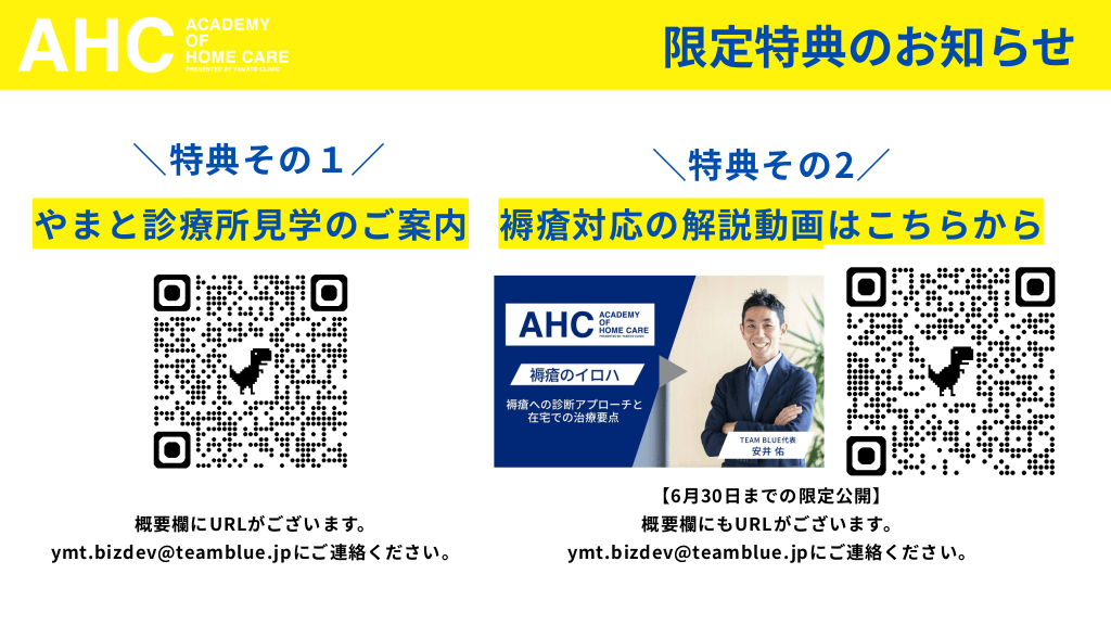 #34. 限定特典のお知らせ \特典その1/ \特典その2/ やまと診療所見学のご案内 褥瘡対応の解説動画はこちらから 【6月30日までの限定公開】 概要欄にURLがございます。 概要欄にもURLがございます。 ymt.bizdev@teamblue.jpにご連絡ください。 ymt.bizdev@teamblue.jpにご連絡ください。