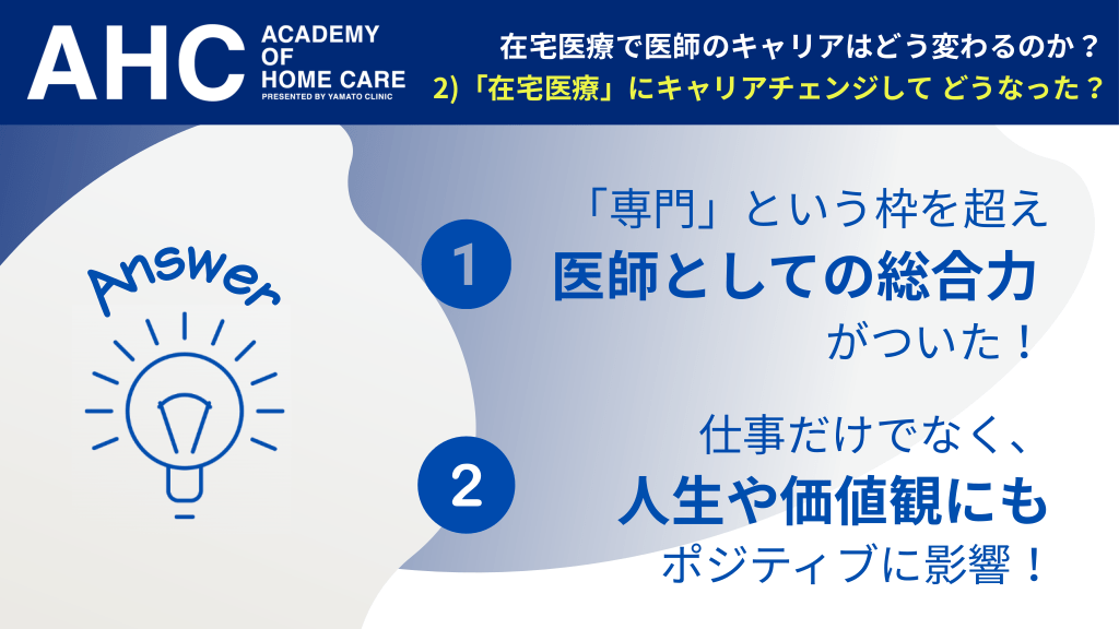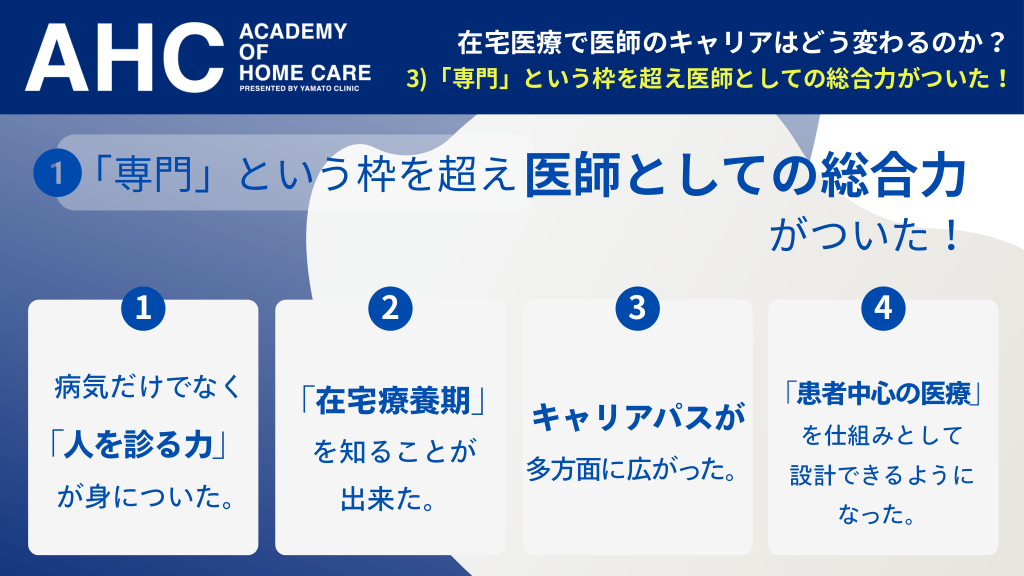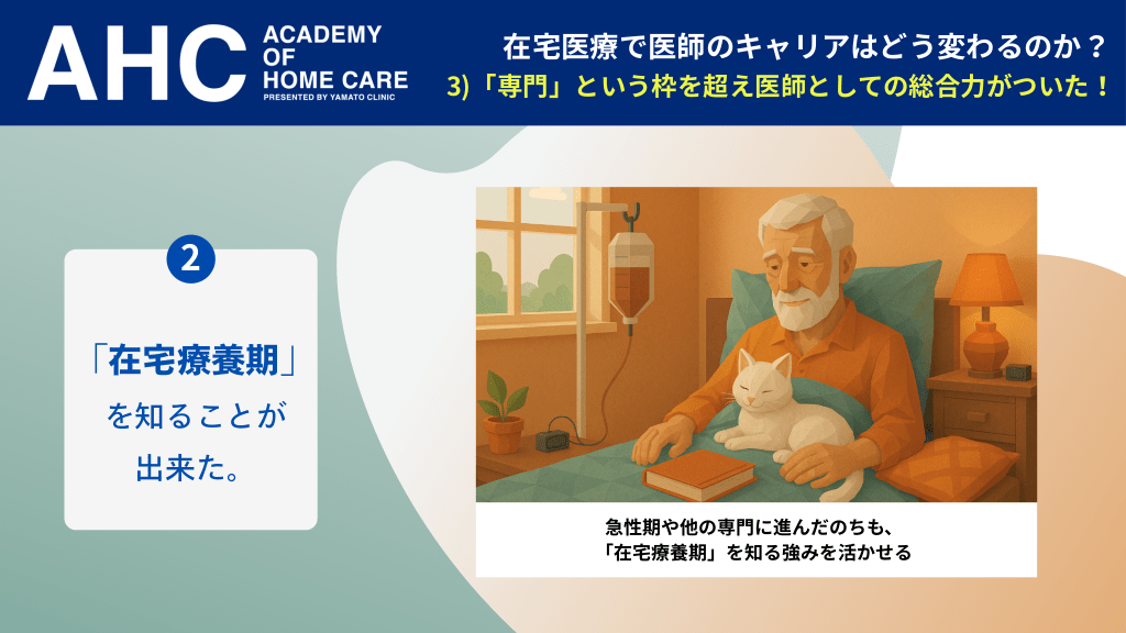 #8. 在宅医療で医師のキャリアはどう変わるのか? 3)「専門」という枠を超え医師としての総合力がついた! 2 「在宅療養期」 を知ることが 出来た。 急性期や他の専門に進んだのちも、 「在宅療養期」を知る強みを活かせる