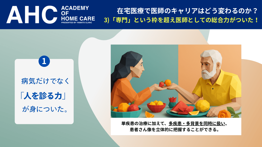 #7. 在宅医療で医師のキャリアはどう変わるのか? 3)「専門」という枠を超え医師としての総合力がついた! 1 病気だけでなく 「人を診る力」 が身についた。 単疾患の治療に加えて、多疾患・多背景を同時に扱い、 患者さん像を立体的に把握することができる。