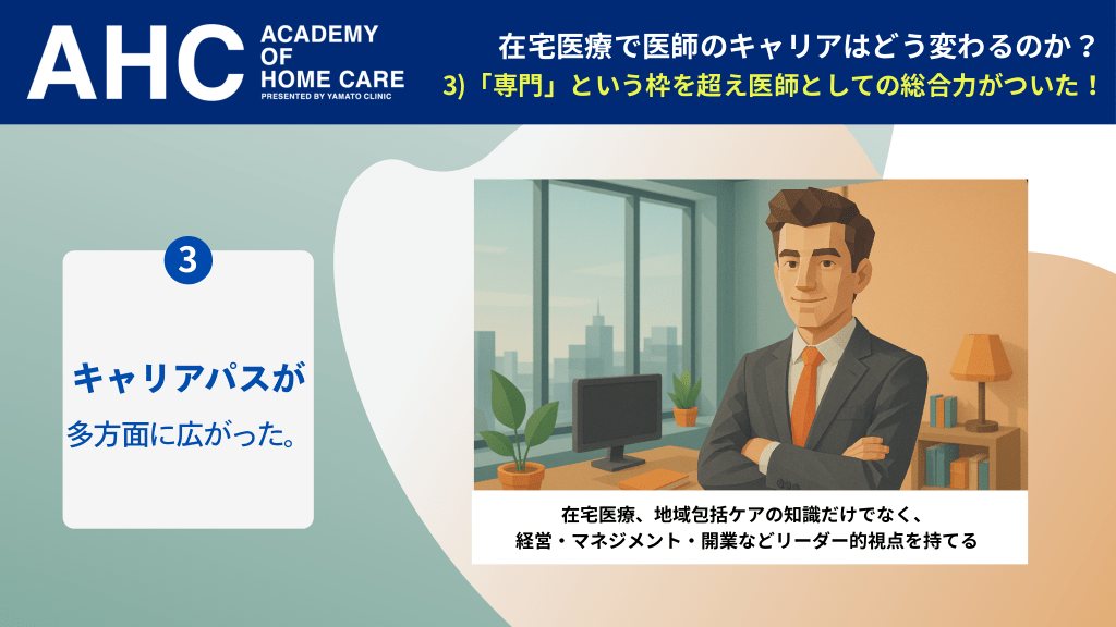 #9. 在宅医療で医師のキャリアはどう変わるのか? 3)「専門」という枠を超え医師としての総合力がついた! 3 キャリアパスが 多方面に広がった。 在宅医療、地域包括ケアの知識だけでなく、 経営・マネジメント・開業などリーダー的視点を持てる