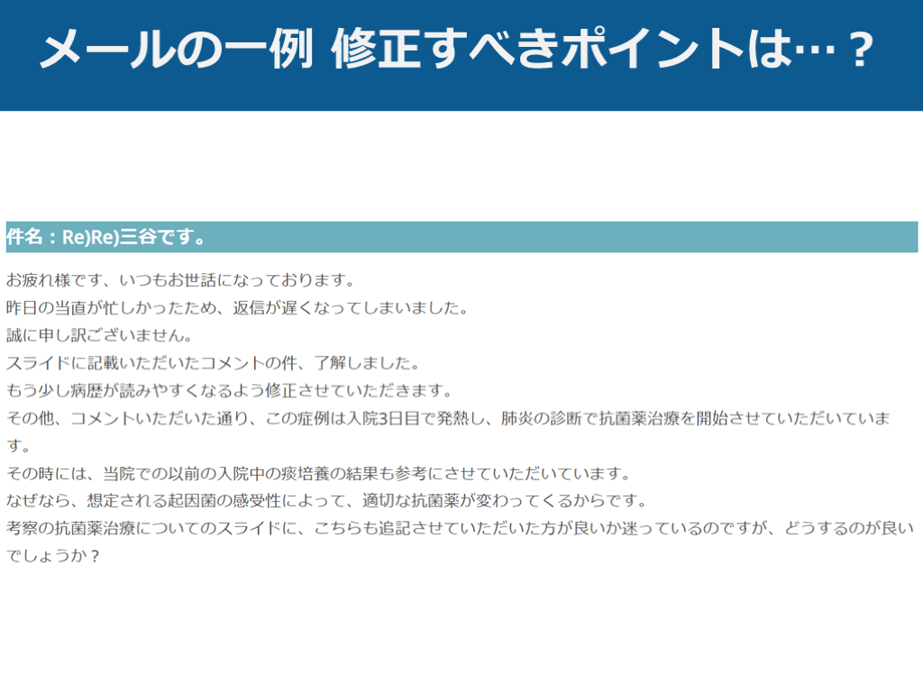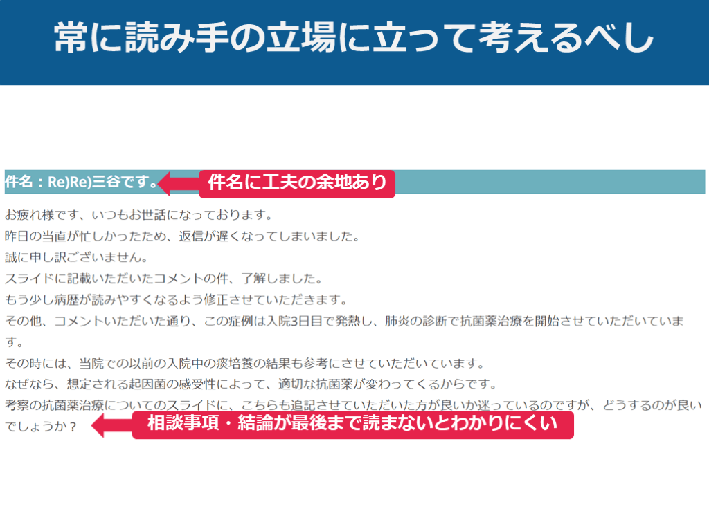 #10. 常に読み手の立場に立って考えるべし 件名に工夫の余地あり 相談事項・結論が最後まで読まないとわかりにくい
