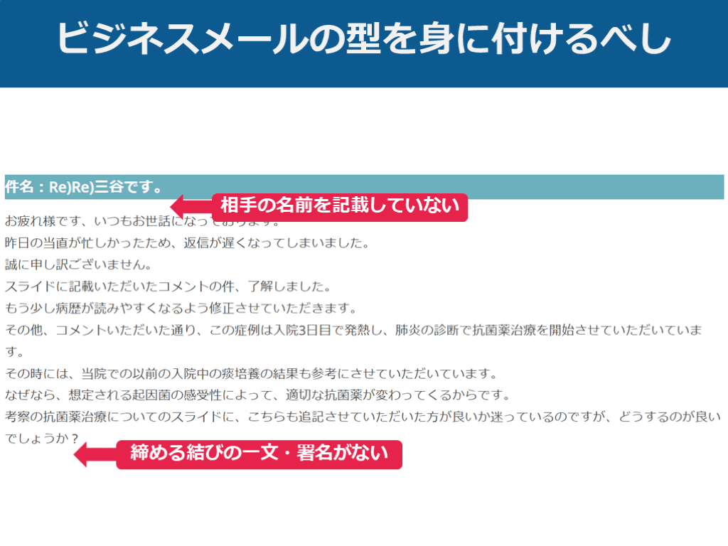 #7. ビジネスメールの型を身に付けるべし 相手の名前を記載していない 締める結びの一文・署名がない