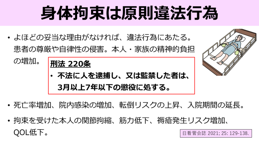 不法に人を逮捕し、又は監禁した者は、3月以上7年以下の懲役に処する。 拘束を受けた本人の関節拘縮、筋力低下、褥瘡発生リスク増加、QOL低下。 死亡率増加、院内感染の増加、転倒リスクの上昇、入院期間の延長。 日看管会誌 2021; 25: 129-138.