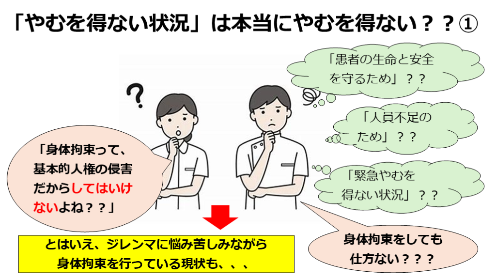 #8. 「やむを得ない状況」は本当にやむを得ない??① 「身体拘束って、基本的人権の侵害だからしてはいけないよね??」 「患者の生命と安全を守るため」?? 「人員不足のため」?? 「緊急やむを