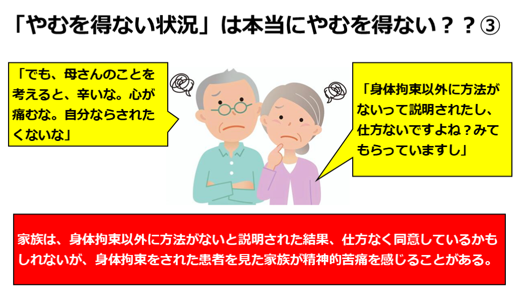 #10. 「やむを得ない状況」は本当にやむを得ない??③ 「でも、母さんのことを考えると、辛いな。心が痛むな。自分ならされたくないな」 「身体拘束以外に方法がないって説明されたし、仕方ないですよね?みてもらっていますし」 家族は、身体拘束以外に方法がないと説明された結果、仕方なく同意しているかもしれないが、身体拘束をされた患者を見た家族が精神的苦痛を感じることがある。