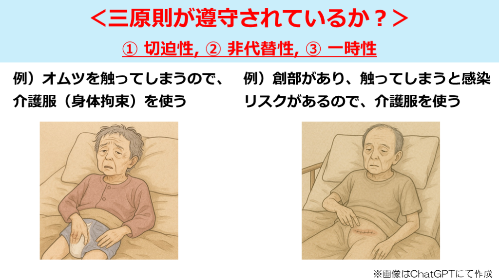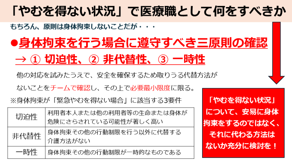 身体拘束を行う場合に遵守すべき三原則の確認→ ① 切迫性、② 非代替性、③ 一時性