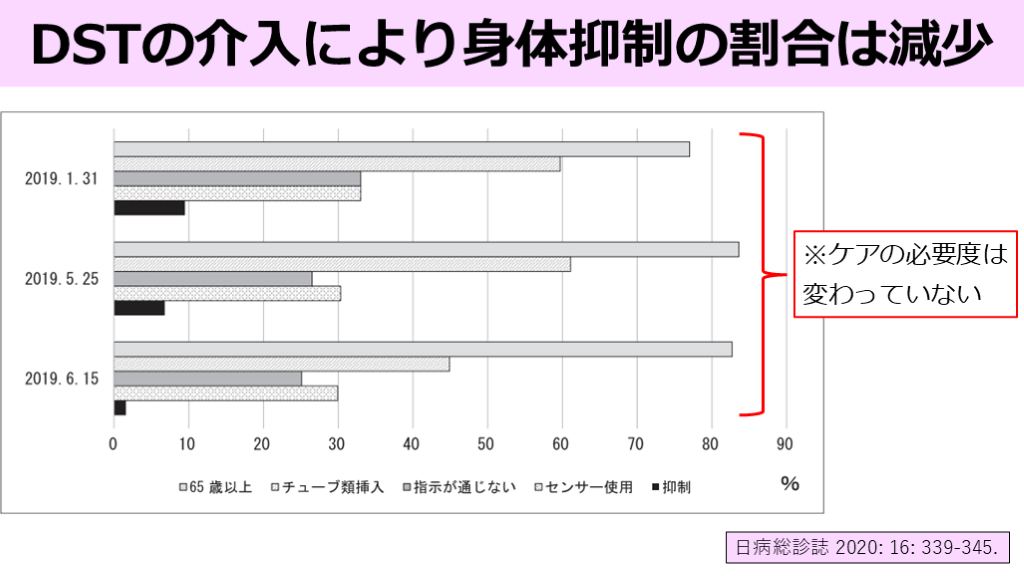 #21. 日病総診誌 2020: 16: 339-345. DSTの介入により身体抑制の割合は減少 ※ケアの必要度は