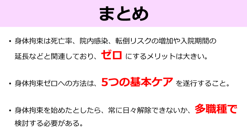#25. まとめ 身体拘束は死亡率、院内感染、転倒リスクの増加や入院期間の延長などと関連しており、ゼロ にするメリットは大きい。 身体拘束ゼロへの方法は、5つの基本ケア を遂行すること。 身体拘束を始めたとしたら、常に日々解除できないか、多職種で検討する必要がある。