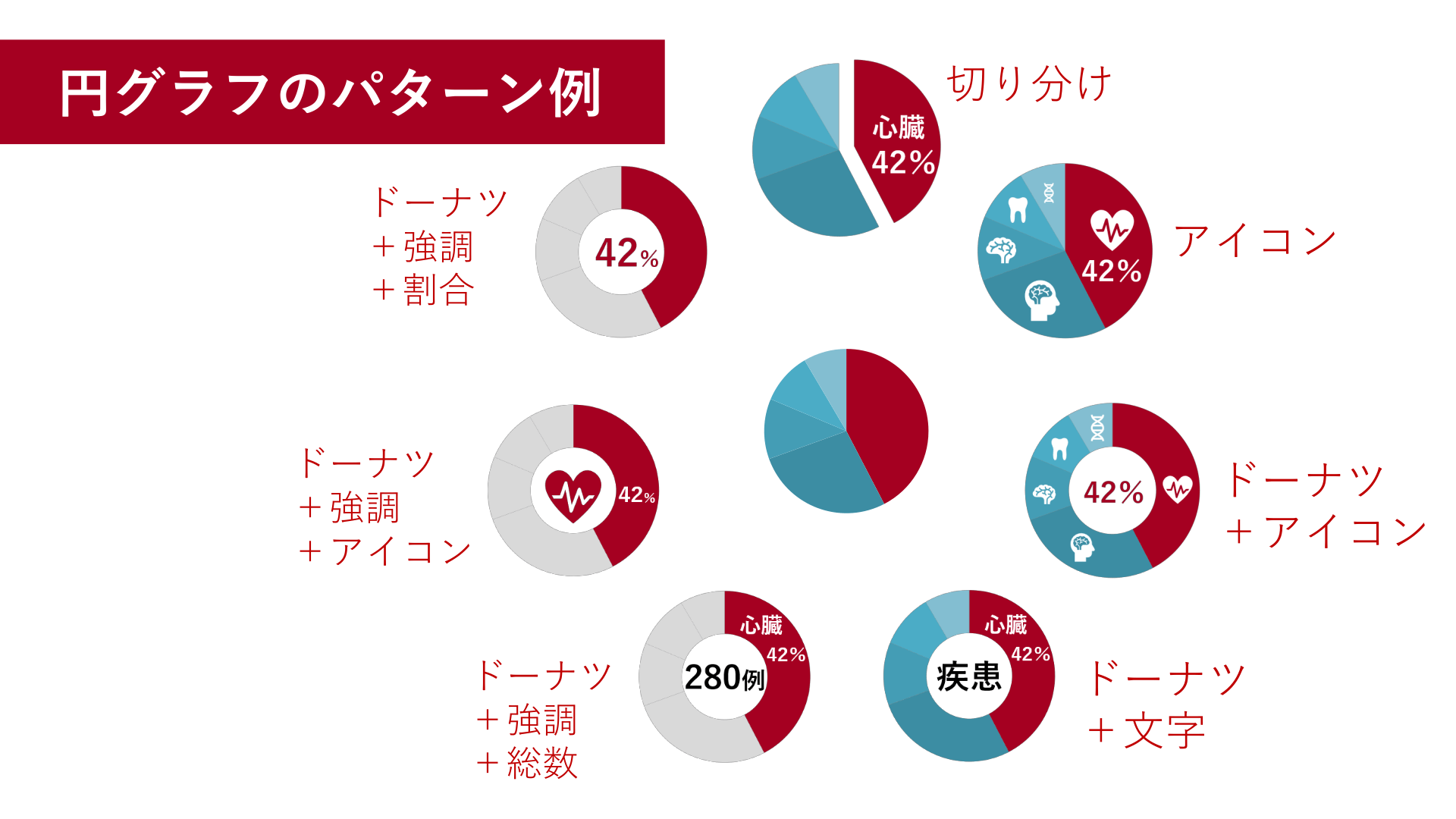 #5. 円グラフのパターン例 ドーナツ +強調 +割合 ドーナツ +強調 +アイコン ドーナツ +強調 +総数 切り分け アイコン ドーナツ +アイコン ドーナツ +文字