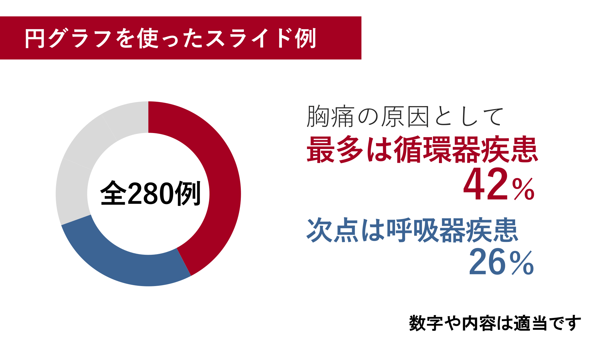 #6. 円グラフを使ったスライド例 胸痛の原因として 最多は循環器疾患 全280例 42% 次点は呼吸器疾患 26% 数字や内容は適当です